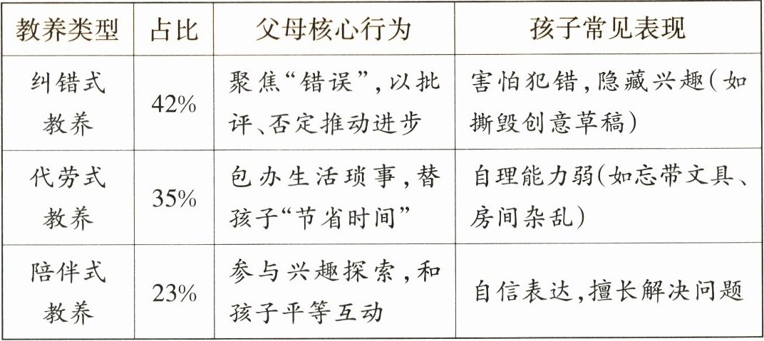 |纠错式教养|42%|聚焦“错误”,以批评、否定推动进步|害怕犯错,隐藏兴趣(如撕毁创意草稿)|