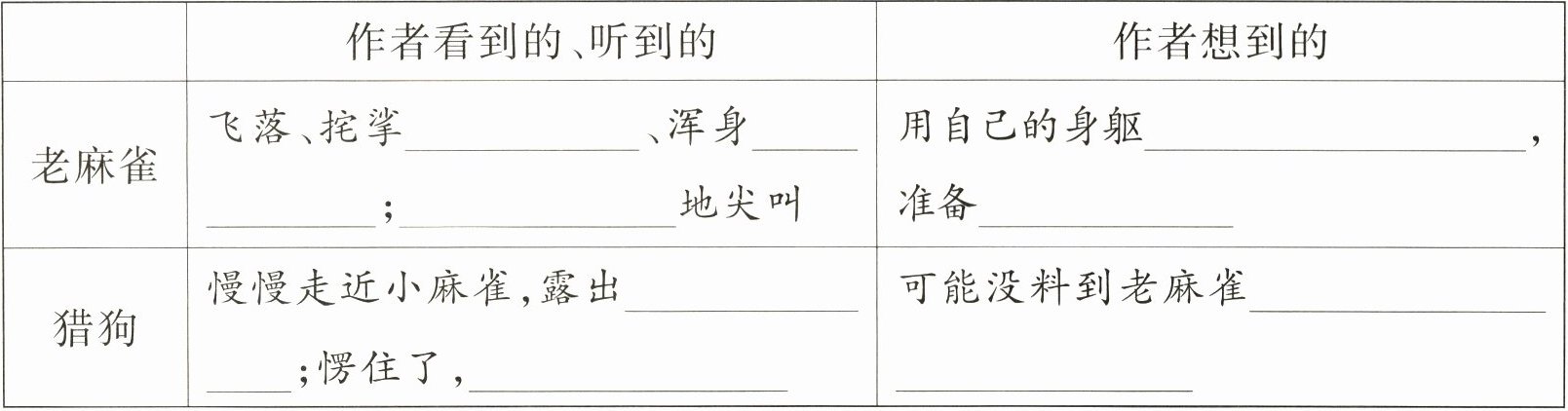 (3)语文要素 选文中,作者把老麻雀拯救幼儿的过程写得很清楚。请你结合关键词句进行概括,将表格补充完整。(每空1分,共8分)