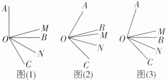 (3)如图(3),当$∠AOB= \alpha $,$∠BOC= \beta $时,$∠MON与\alpha $,$\beta $有数量关系吗?如果有,请写出结论并说明理由。