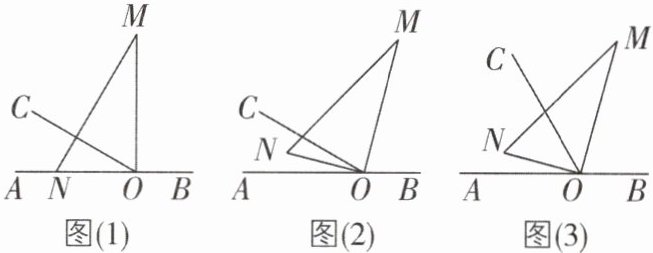 2 [2025 广东潮州期末,中]如图(1),O为直线AB上一点,过点O作射线OC,$∠AOC = 30^{\circ}$,将一直角三角板($∠M = 30^{\circ}$)的直角顶点放在点O处,一边ON在射线OA上,另一边OM与射线OC都在直线AB的上方.(注:本题中最大旋转角度为$180^{\circ}$)