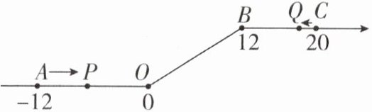 5[2025甘肃兰州期末,较难]如图,将一条数轴在原点O和点B处各折一下,得到一条“折线数轴”,图中点A表示-12,点B表示12,点C表示20,我们称点A和点C在数轴上相距32个单位长度,动点P从点A出发,以2单位长度/秒的速度沿着“折线数轴”的正方向运动,从点O运动到点B期间速度变为原来的一半,之后立刻恢复原速;同时,动点Q从点C出发,以1单位长度/秒的速度沿着数轴的负方向运动,从点B运动到点O期间速度变为原来的两倍,之后也立刻恢复原速,设运动的时间为t秒.