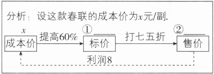 【解】①(1+60%)x;②75%×(1+60%)x.根据题意,得75%×(1+60%)x-x=8,解得x=40,所以(1+60%)x=(1+60%)×40=64.答:这款春联每副的标价是64元.