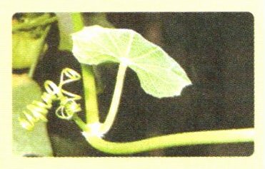 [示例]瓜藤弯曲的茎上长着嫩绿的叶子。叶柄旁边长着绿色的卷须,就像一缕弯曲的绿色丝线,透出勃勃生机。