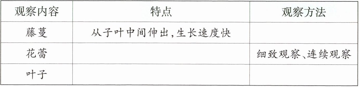 (1)观察内容 特点 观察方法 藤蔓 从子叶中间伸出,生长速度快 连续观察 花蕾 头一批的像谷粒那么大,很快萎去 细致观察、连续观察 叶子 颜色绿,非常厚,像丝绒 细致观察