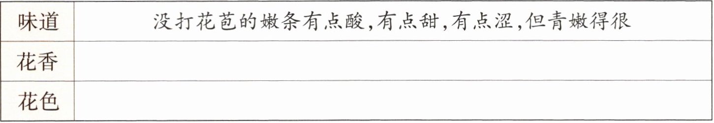 (2)味道 没打花苞的嫩条有点酸,有点甜,有点涩,但青嫩得很 花香 浓郁而甜腻 花色 花朵是纯白的、浅粉的,花蕊是黄色的