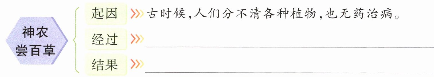 (1)神农遍尝百草差点儿中毒身亡,后来因为有了赭鞭而减少了危险。神农写出了《本草经》,帮助了很多人。