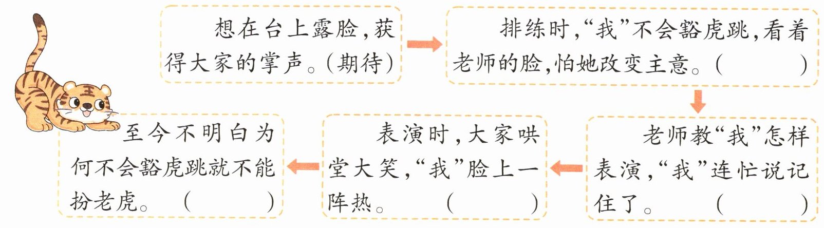想在台上露脸,获得大家的掌声。(期待) → 排练时,“我”不会豁虎跳,看着老师的脸,怕她改变主意。( ) → 表演时,大家哄堂大笑,“我”脸上一阵热。( ) → 老师教“我”怎样表演,“我”连忙说记住了。( ) → 至今不明白为何不会豁虎跳就不能扮老虎。( )