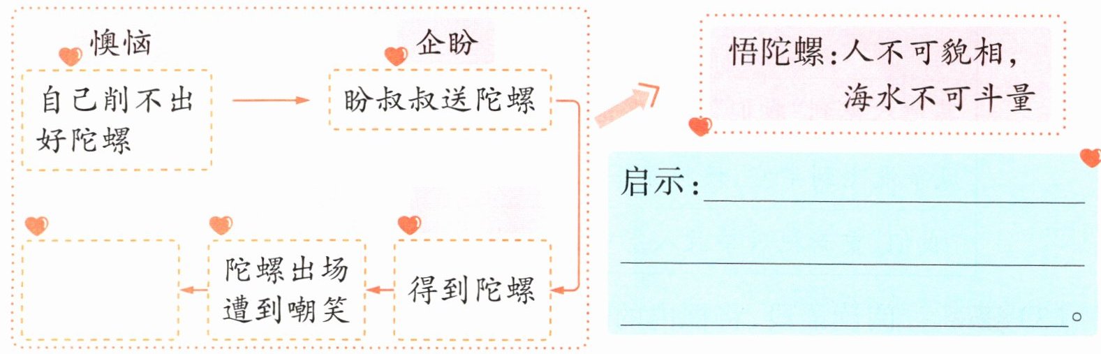 懊恼 企盼 自己削不出 盼叔叔送陀螺 悟陀螺:人不可貌相, 好陀螺 海水不可斗量 启示: