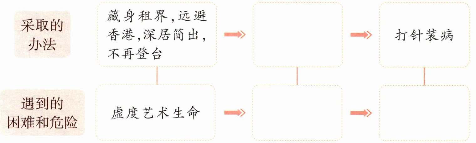 4 [教材变式题·新题型] 为了拒绝给日本人演戏,梅兰芳采取了哪些办法?又遇到了哪些困难和危险?请补充思维导图,并填空。