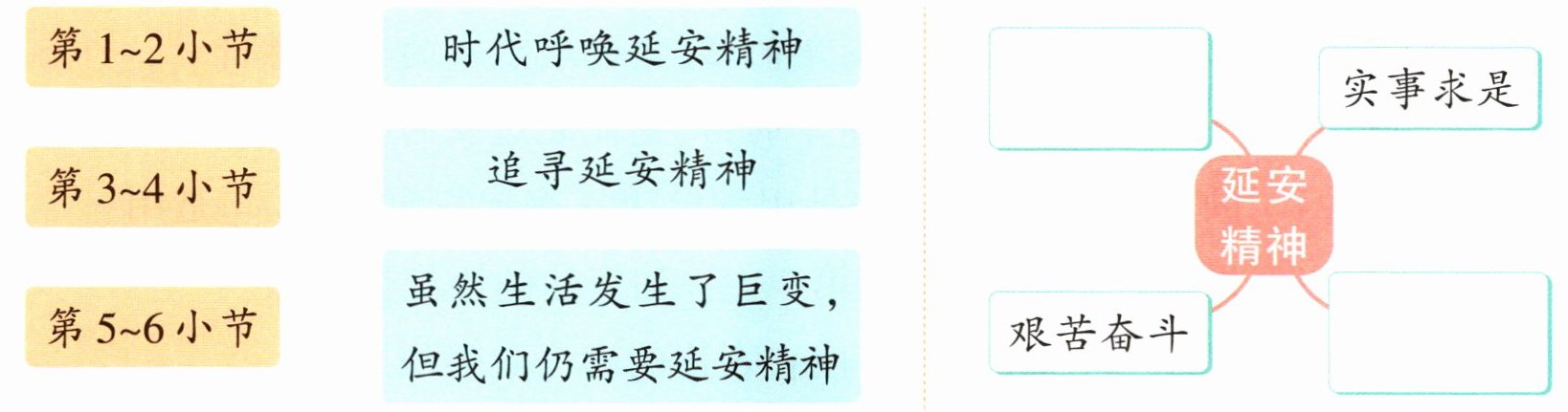 4〔教材变式题〕诗歌各部分分别讲了什么? 先连一连,再写出延安精神的内涵。