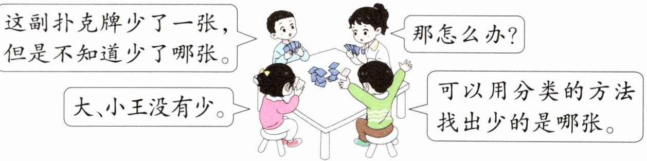 你会怎么分类找出少的那张扑克牌?写一写。