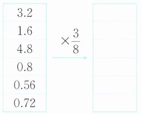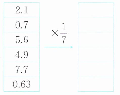 $\begin{array}{|c|c|c|} \hline 2.1 & & \\ \hline 0.7 & × \frac{1}{7} & \\ \hline 5.6 & & \\ \hline 4.9 & & \\ \hline 7.7 & & \\ \hline 0.63 & & \\ \hline \end{array}\\ \hline $ $\begin{array}{|c|c|c|} \hline 3.2 & & \\ \hline 1.6 & × \frac{3}{8} & \\ \hline 4.8 & & \\ \hline 0.8 & & \\ \hline 0.56 & & \\ \hline 0.72 & & \\ \hline \end{array}\\ \hline $