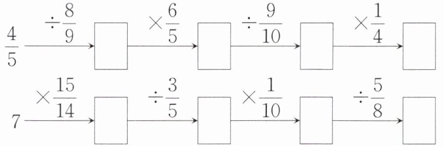$\frac {4}{5}\xrightarrow {÷\frac {8}{9}}□\xrightarrow {×\frac {6}{5}}□\xrightarrow {÷\frac {9}{10}}□\xrightarrow {×\frac {1}{4}}□$