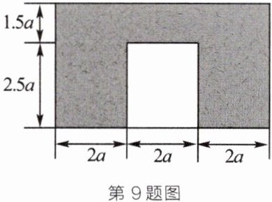 解:长方形草坪的长为 $2a + 2a + 2a = 6a$(m),宽为 $1.5a + 2.5a = 4a$(m),面积为 $6a × 4a = 24a^{2}$(m²)。停车场为长方形,长为 $2.5a$ m,宽为 $2a$ m,面积为 $2.5a × 2a = 5a^{2}$(m²)。绿地面积 = 长方形草坪面积 - 停车场面积,即 $24a^{2} - 5a^{2} = 19a^{2}$(m²)。