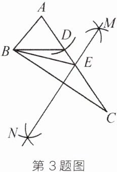 3. ◎2024 大连高新园区期中 如图,在△ABC 中,以点 A 为圆心,AB 长为半径作弧,交 AC 于点 D,连接 BD,再分别以点 B,C 为圆心,大于 $\frac{1}{2}BC$ 的长为半径作弧,两弧相交于点 M,N,作直线 MN,交 AC 于点 E,连接 BE,若∠ABE= α,则∠DBC= ______.(用含α的代数式表示)
