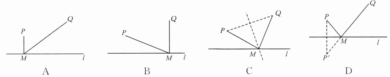 4. 教材变式 有一条笔直的河l,牧马人从P地出发,到河边M处饮马,然后到Q地,现有如下四种方案,其中可使牧马人所走路径最短的是 ( )