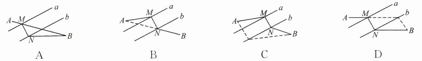 5. 教材变式 河流的两岸a与b互相平行,其两侧有村庄A和村庄B,现在要在河上建一座桥MN(桥与河岸垂直),使两个村庄之间的距离最小,从作图痕迹看,正确的是 ( )