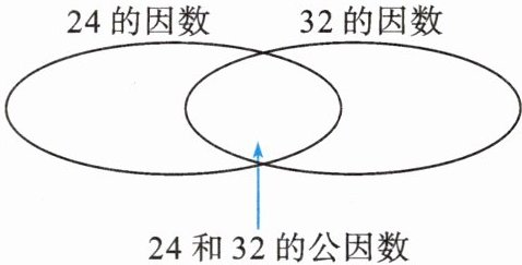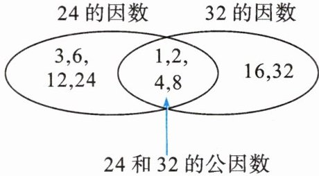 在图中,左边圈里填$24$的因数中除公因数外的数,即$3, 6, 12, 24$;右边圈里填$32$的因数中除公因数外的数,即$16, 32$;中间相交部分填$24$和$32$的公因数$1, 2, 4, 8$。