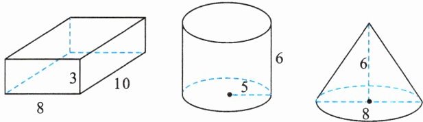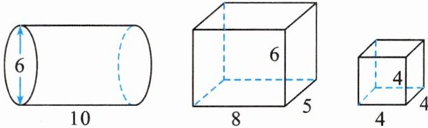 (1)3.14×(6÷2)²×2 + 3.14×6×10=244.92(平方分米)(8×5+8×6+6×5)×2=236(平方分米)4×4×6=96(平方分米)(2)8×10×3=240(立方厘米)3.14×5²×6=471(立方厘米)3.14×(8÷2)²×6×$\frac{1}{3}$=100.48(立方厘米)