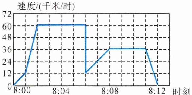 某天,王叔叔早上$8:00$从家开车去上班,半途中突然有一只猫冲到车前,他用力刹车才没有撞上猫。之后,王叔叔继续开车去上班。曲线图是王叔叔行车的速度记录。