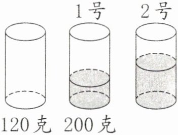 (1)80 解析:根据题图可知,1个空杯子重120克,1号杯子和水共重200克,所以1号杯中的水重200-120=80(克)。(2)270 解析:根据题意,可求出2号杯子中有水80+70=150(克),则2号杯子和水一共重150+120=270(克)。