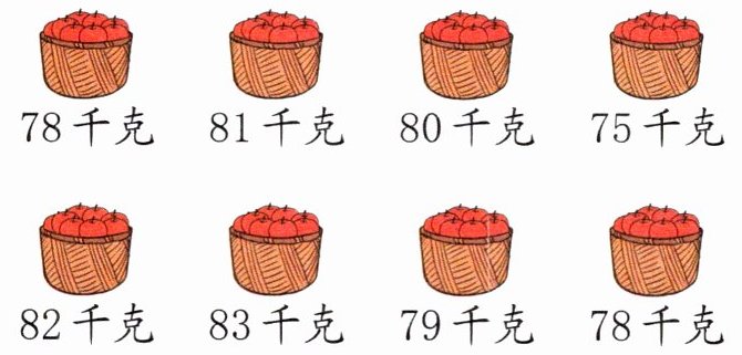 80×8=640(千克) 解析:每筐苹果都接近80千克,可以将每筐苹果的质量看作80千克,有这样的8筐,摘的苹果大约有80×8=640(千克)。