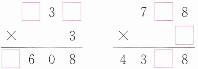 解析:第一个竖式,积的个位上是8,因为 $3×6=18$,所以确定三位数的个位上是6。十位上 $3×3+1=10$,积的十位上是0,向百位进1。因为积的百位上的6是进一后得来的,所以3乘三位数百位上的数字所得到的积的个位上应该是5。因为 $3×5=15$,所以确定三位数的百位上是5。第二个竖式,积的个位上是8,因为 $8×6=48$,$8×1=8$,所以一位数可能是6,也可能是1。因为积是四位数,所以一位数是6。三位数十位上的数字可以用列举法从0开始去试:$708×6=4248$,$718×6=4308$,$728×6=4368$,$738×6=4428$,最后确定三位数的十位上是1或2。
