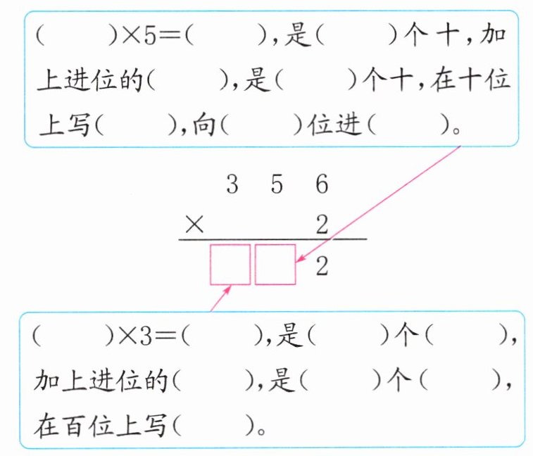 (2) $(2)×5=(10)$,是(10)个十,加上进位的(1),是(11)个十,在十位上写(1),向(百)位进(1)。
