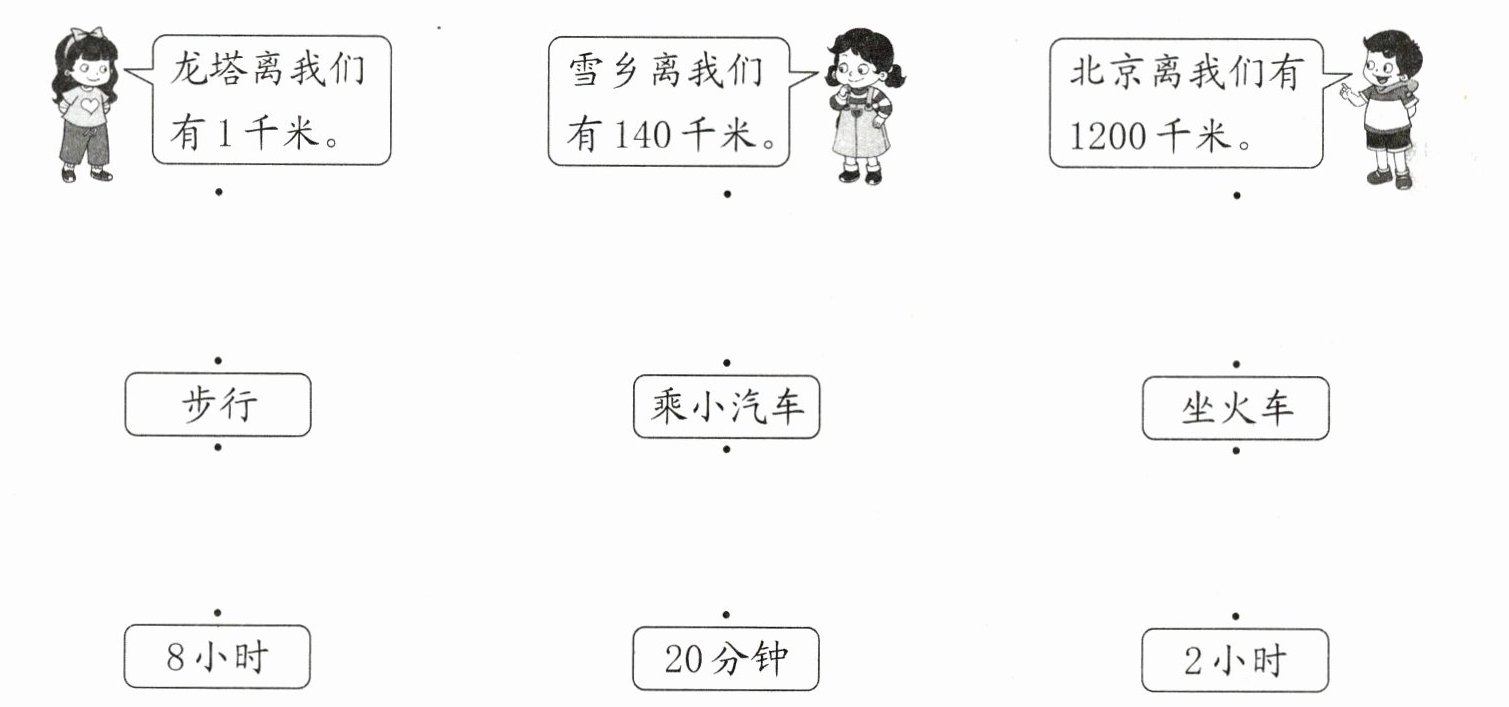 2. 新情境 生活应用 他们选择什么方式出行比较合适? 大概需要多长时间才能到?连一连。(6 分)