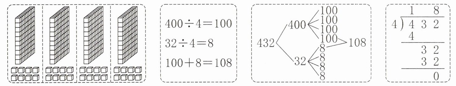 1. 新趋势 算理理解 下面计算$432÷4$的方法中,正确的有( )个。
