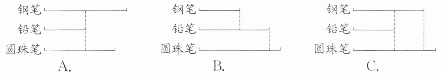 1. 新趋势 数形结合 钢笔有28支,铅笔的支数是钢笔的一半,圆珠笔比铅笔多10支。下面的线段图中,符合题意的是( )。