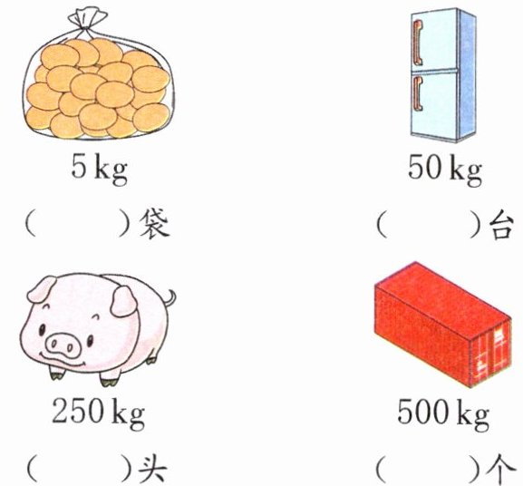 (2)在下面的( )里填合适的数,使每种物品的总质量都是1t。