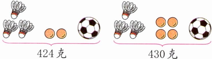 430−424 = 6(克) 4−2 = 2(个)6÷2 = 3(克)解析:通过观察,发现题中第二幅图比第一幅图多2个