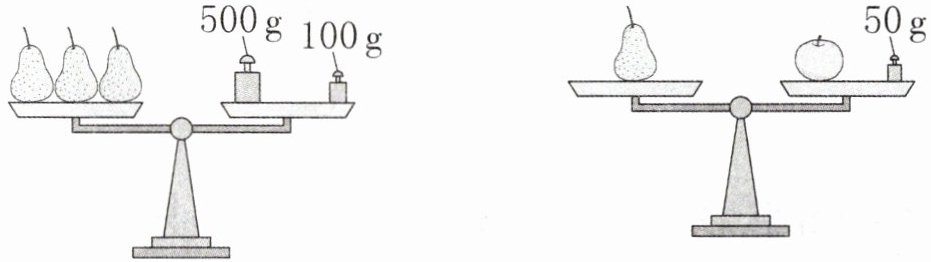 答案不唯一,如问题一:每个梨多少克?$500+100=600(g)$$600÷3=200(g)$ 问题二:每个苹果多少克?$200-50=150(g)$