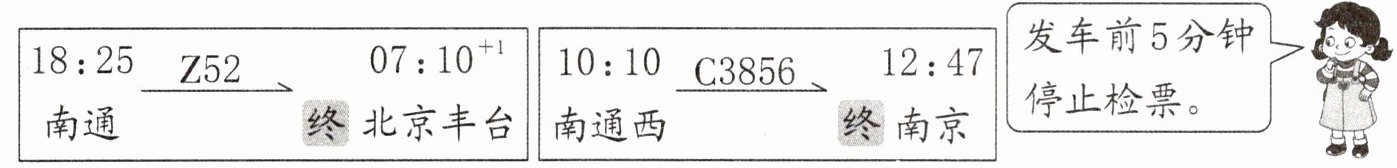 (2) 新情境 生活应用 张叔叔要从南通乘坐C3856次列车去南京,他从家到南通西站检票口要35分钟,他最晚要在上午( )时( )分从家出发才不会误车。