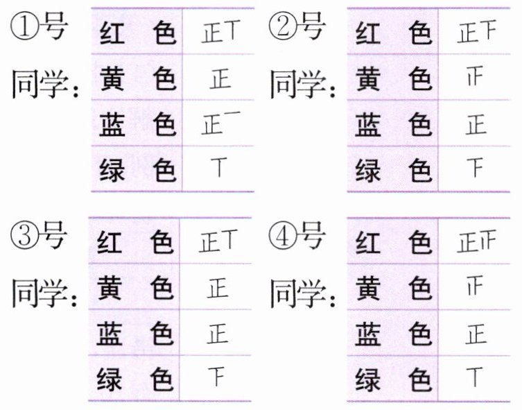 涂红、黄、蓝、绿四种颜色。四名同学做游戏,每人转动转盘20次,画“正”字记录指针指向每种色块的次数。$\begin{tabular}{|c|c|c|c|}\hline\multicolumn{4}{|c|}{\makecell{①号\\同学:}} \\\hline\multicolumn{2}{|c|}{\makecell{红色\\}} & $黄色 & 蓝色$ \\\hline\multicolumn{2}{|c|}{\makecell{正T\\}} & $正 & 正一$ \\\hline\multicolumn{2}{|c|}{\makecell{绿色\\T}} & & \\\hline\end{tabular}\\\hline \begin{tabular}{|c|c|c|c|}\hline\multicolumn{4}{|c|}{\makecell{②号\\同学:}} \\\hline\multicolumn{2}{|c|}{\makecell{红色\\}} & $黄色 & 蓝色$ \\\hline\multicolumn{2}{|c|}{\makecell{正下\\}} & $正 & 正$ \\\hline\multicolumn{2}{|c|}{\makecell{绿色\\下}} & & \\\hline\end{tabular}\\\hline \begin{tabular}{|c|c|c|c|}\hline\multicolumn{4}{|c|}{\makecell{③号\\同学:}} \\\hline\multicolumn{2}{|c|}{\makecell{红色\\}} & $黄色 & 蓝色$ \\\hline\multicolumn{2}{|c|}{\makecell{正T\\}} & $正 & 正$ \\\hline\multicolumn{2}{|c|}{\makecell{绿色\\下}} & & \\\hline\end{tabular}\\\hline \begin{tabular}{|c|c|c|c|}\hline\multicolumn{4}{|c|}{\makecell{④号\\同学:}} \\\hline\multicolumn{2}{|c|}{\makecell{红色\\}} & $黄色 & 蓝色$ \\\hline\multicolumn{2}{|c|}{\makecell{正正\\}} & $正 & 正$ \\\hline\multicolumn{2}{|c|}{\makecell{绿色\\T}} & & \\\hline\end{tabular}\\\hline