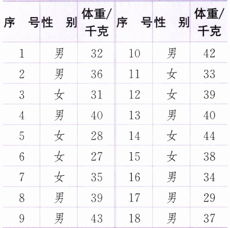 (1)$根据上面的调查结果分别填写下面的表格。$\begin{tabular}{|c|c|c|}\hline$性别 & 男 & 女$ \\\hline人数 & & \\\hline\end{tabular}\\\hline \begin{tabular}{|c|c|c|c|}\hline$体重 & 30千克以下 & 30~40千克 & 40千克以上$ \\\hline人数 & & & \\\hline\end{tabular}\\\hline (2)$体重在哪个范围内的人数最多?