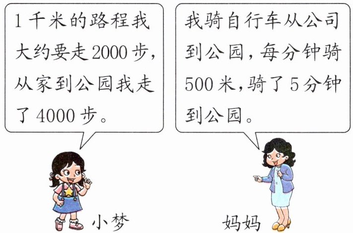 2000步是1千米,4000步就是2千米 2千米=2000米 $500×5=2500$ (米) $2000<2500$ 出发前妈妈离公园更远