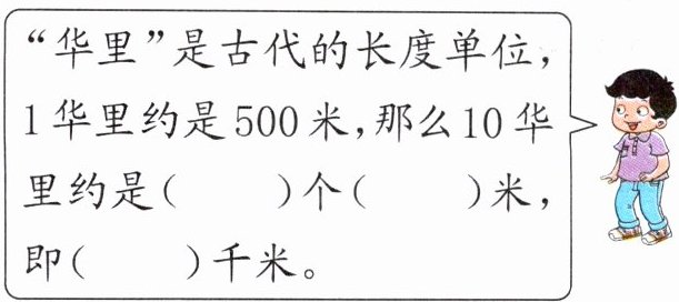 1500 10 500 5 解析:1000华里是100个10华里,也就是100个5千米,即500千米,所以这匹千里马3天最多可以跑 $500×3=1500$ (千米)。