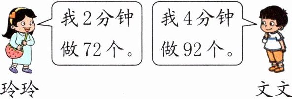 玲玲:$72÷2 = 36$(个) 文文:$92÷4 = 23$(个) $36>23$ 玲玲每分钟做得多