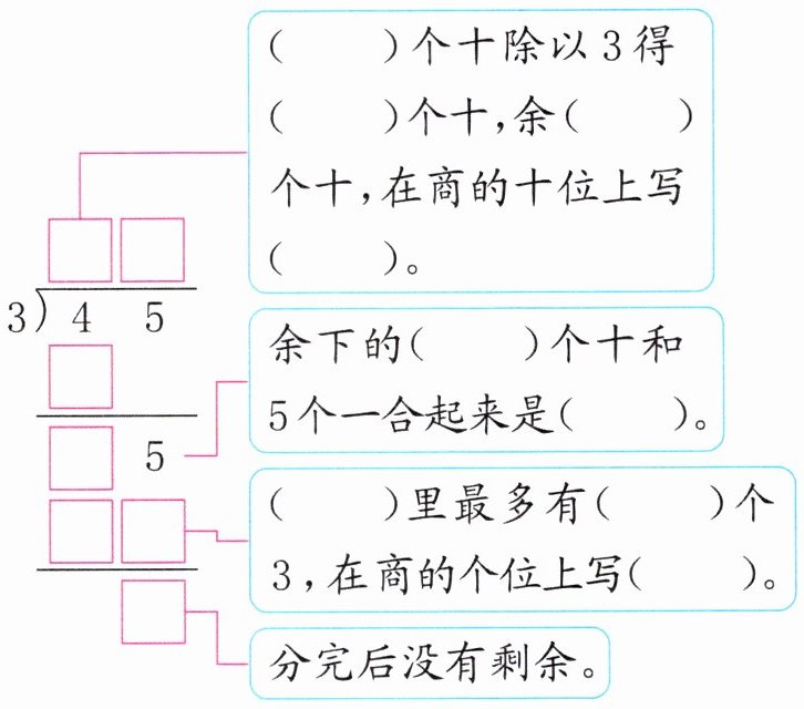 (2) B 易错分析:容易将几个十看成几个一。箭头①指的数字“1”表示先将4个十除以3,每个班分得1个十,即每个班先分10本。箭头②指的数字“3”表示3个班一共分掉3个10本,即30本。