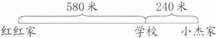 3. 红红从家出发经过学校去小杰家借书,然后立即沿原路返回到家。红红一共走了多少米?(4分)