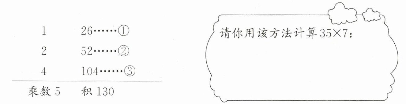 4. 新趋势 数学文化 古埃及纸书上记载着一种乘法——倍乘法,就是先加倍计算,再组合不同的倍数和,从而完成计算。左下图是用倍乘法计算$26×5$的过程,每行由上一行取2倍得出,最后把①③两项加起来,其算理为$26×1+26×4= 130$。(4分)