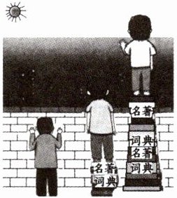 墙前站着三个人,站在地面的人,眼前只有墙;站在较高的由名著和词典组成的书堆上的人,越过墙看到了黑暗;站在最高的由名著和词典组成的更高的书堆上的人,越过墙和黑暗,看到了太阳和光明。