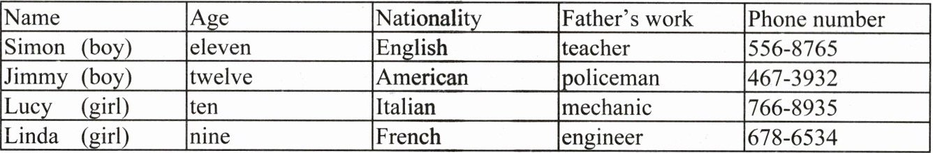 | Linda (girl) | nine | French | engineer | 678 - 6534 |______
