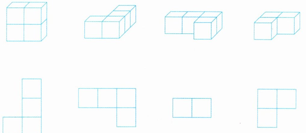 2. 上下两层都是两个正方形的立体图形连两个左右相连的正方形;一排四个正方形的立体图形连四个左右相连的正方形;类似“T”型的立体图形连四个正方形(类似“T”型);类似“L”型的立体图形连三个正方形(类似“L”型)。