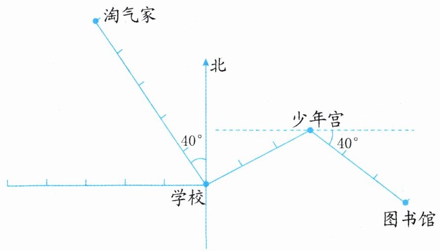 2. 淘气家在学校北偏西40°方向2000m处,图书馆在少年宫东偏南40°方向1200m处,下面是淘气从家坐出租车去图书馆的路线图。已知出租车在2.5km以内(含2.5km)按起步价8元计算,以后每增加1km车费就增加2元。请你按题中提供的信息算一算,淘气一共要花
