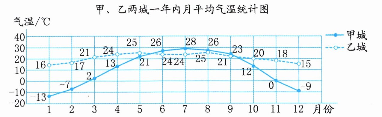 2. 下面是甲、乙两城一年内月平均气温变化情况的统计图。