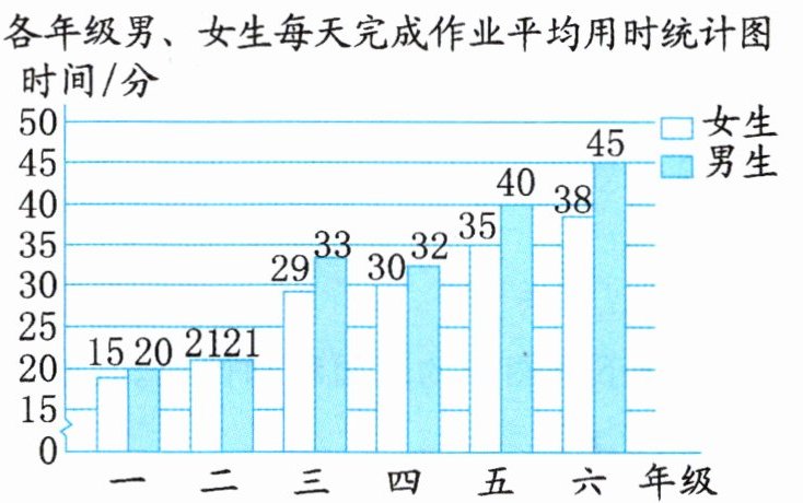 4. 下面是各年级男、女生每天完成作业平均用时情况的统计图。