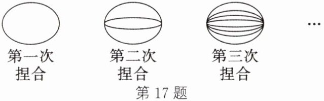 17. (新考法·结论开放题)如图,拉面馆的师傅用 1 根很粗的面条,把两头捏合在一起拉伸,再捏合,再拉伸,反复几次,就把这根很粗的面条拉成了许多根细的面条.第一次捏合后,可以拉出 2 根面条;第二次捏合后,可以拉出 4 根面条;第三次捏合后,可以拉出 8 根面条……